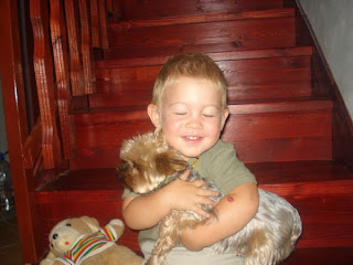 Mi annyira,de annyira szeretjük egymást...Mikor hazaérünk azonnal leguggolok Puszihoz,hogyösszeugrálhasson és összenyalogathasson.Ha mami nevelni próbál,Puszi megugatja.Ha sírok,Puszi is sír.És a lényeg:ELKEZDTEM BESZÉLNI!!!Első szavam:puszi.De még aznap(ma) mondtam azt is többször,hogy kutya és Apa.Mami nevét nem vagyok hajlandó a számra venni.Az ott és az ez már régóta megy.
