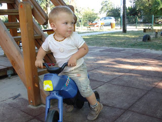 Imádom a motorokat(brrrr...)Otthon van egy szupi négykerekű járgányom,de mégiscsak a szomszéd fűje zöldebb.Úgyhogy miután megérkezünk a játszótérre,azonnal felmérem a terepet,van-e elárvult kismotor.Ha igen,késlekedés nélkül lecsapok rá,és hozzáragasztom a fenekemhez,ahonnan az eltávolítása igen nehézkes.Ha motorozok,Mami boldog,mert leteheti a fenekét a padra.Csak néha kell segítenie egy-egy koccanás után helyreállítani a romokat.