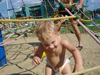 A nagy melegre való tekintettel újfennt pancsolásra adtuk a fejünket.Már egyre jobban élvezem a medencét,Mami bánatára egyre bátrabb is vagyok,úgyhogy alig győzött utánam rohangálni.Apa is élvezte a napot,főleg a sorban állást,hogy ebédhez jussunk.A képen éppen a homokozó mászókáját próbálom meghódítani Apa felügyeletében.Persze a sör elengedhetetlen tartozéka a felügyeletemnek