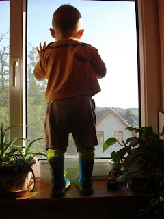 Amióta megkaptam a szuper gumicsizmámat,sajna nem esett az eső.Hallottatok már ilyet????Úgyhogy egyik reggel elővettem,és addig cipeltem Mami után,amíg hajlandó volt rámadni;-)......amikor Apa elindul a motorján a dolgozóba,Én így lesem az ablakból.Integetek,és néha hajlandó vagyok puszit dobni Neki.Kár,hogy nem látja.