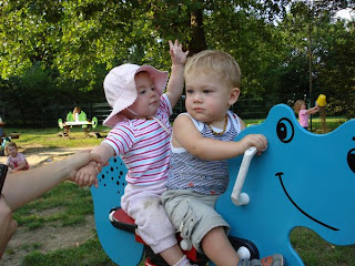 Múlt héten randit szervezett nekem Mami rég nem látott Emma barátnőmmel.Az történt ugyanis,hogy mióta megszületett Oli,Emma kistesója,ritkábban tudunk találkozni,mert sajna nem olyan mobilisak,mint régen.Így összekötöttük a kellemest a hasznossal,és cipővásárlás után közös játszóterezésre invitáltuk a Lukács familiát.A játszótér szuper volt,volt ellopható kismotor,babakocsi,a nagyfiúknak biciklijük volt(amit sajna nagyon féltettek tőlem),óriási homokozó,mászóka,miegyéb.Emma sikongatva kergetett ölelgetés céljából,amit én nehanapján zaklatásnak tituláltam,és mérges képet vágtam.Mami szerint pár év múlva visszasírom még ezt a kergetőzést.Oli is jól bírta a délutánt,kisebb megszakításokkal a babakocsijában szuszókált.És még egy új cipőre is szert tettünk